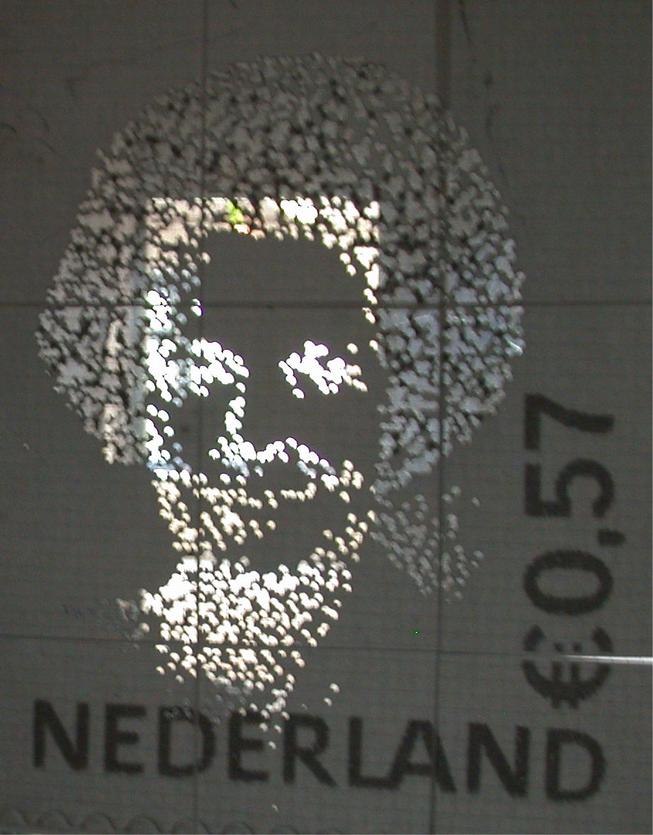 Twee dagen voor de opening van onze gezamelijke tentoonstelling Post Verlaten in Oss schoot me te binnen dat er een leuke overeenkomst was en zou zijn met de afscheid nemende Koningin Beatrix en de postzegel die al lang in gebruik was van haar portret in vorm van punten. Als deze punten uitgeprikt zouden worden en er dus een beeld zou ontstaan waar men doorheen kan kijken geeft dat een extra waarde.